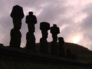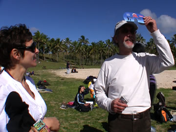 南半球では、太陽は東からのぼり「北の空」を通って西に沈みます。この画面で言うと、右から左に進みます。三脚を立てたのはモアイ像の真っ正面。ちょうど太陽が真ん中のモアイ像の頭上を越える時、皆既が起こるはずです。