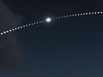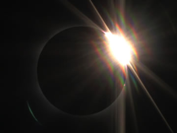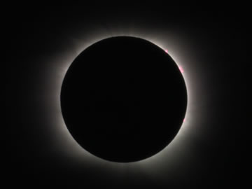 太陽の周りにコロナが現れました。コロナの淡い光は、太陽の明るく光っている部分が月に隠される皆既の時だけにしか、見ることができません。