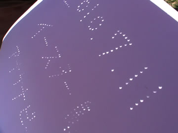 画用紙に小さな穴を開けて文字を書き、もう一枚の画用紙にかざすことで、こんな遊びを楽しむことができます。