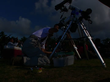 日本からの観光客は、用意周到に日食グラスや双眼鏡、望遠鏡、カメラなど観測グッズを持参してきます。ところが海外の観光客は、手ぶら同然の人も多いです。機材をずらりと並べて、撮影している私たちの撮影チームがものめずらしいのか、たくさんの外国人が寄って来て、ビデオのモニターをのぞいたり、日食グラスを借りて観察したりしていました。