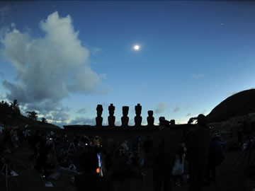 モアイの頭上で迎えた見事な皆既日食。暗くなった空に、内惑星である水星と金星が現れました。地球が太陽系であることを実感できる貴重な瞬間です。