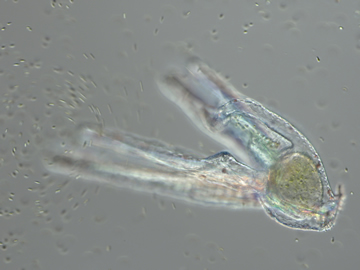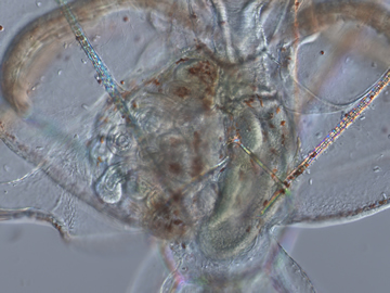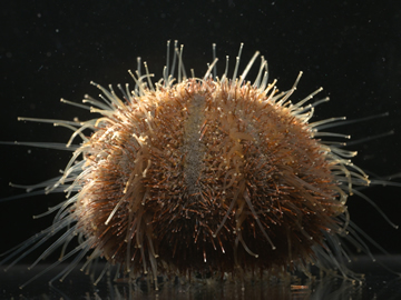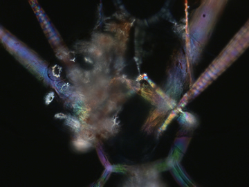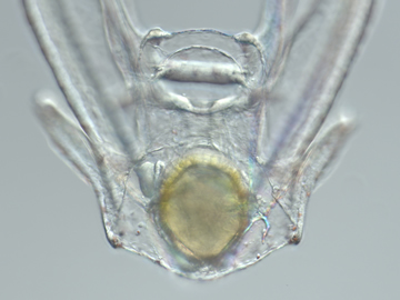 ウニの幼生は、ケイ藻などの植物プランクトンを食べます。腕を縁取る繊毛帯にある繊毛を動かすことで、水流を作り出し、口の中へプランクトンを導きます。