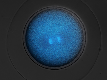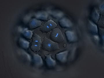 細胞を生かしたままDNAを染色できる蛍光色素、ヘキスト(Hoechst)で染色した受精卵の卵割が進む様子。青く光っているのは染色体。