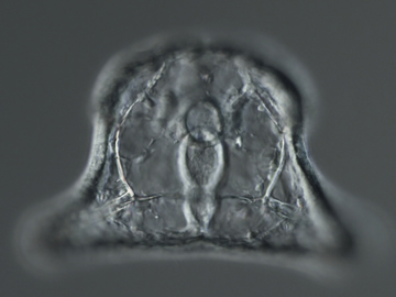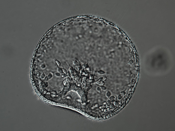 受精からおよそ10時間後。胚の一部が内側にへこみ始めます。原腸陥入とも呼ばれます。このくぼみを原口、その先に伸びた管を原腸と言います。